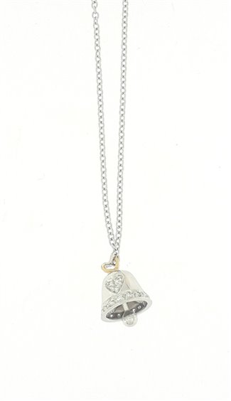 Collar de oro blanco de 18 kt. con anillo de campana en oro blanco y brillante. Cierre de mosquetón - anillo de cordón a 42 cm