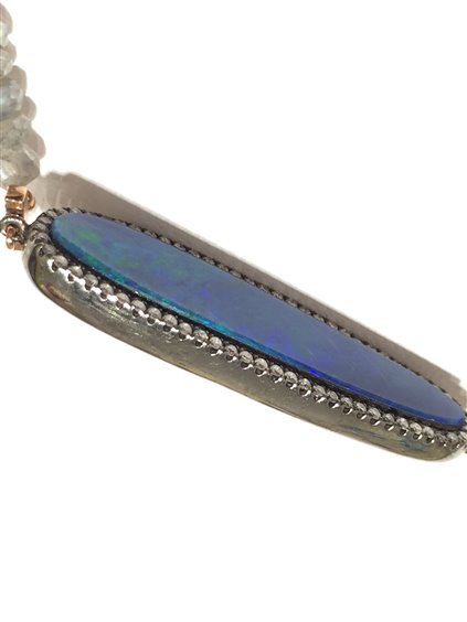 Pulsera compuesta por 2 tramos de labradorita ensartados en hilo de acero con detalles en oro rosa 750.La parte central está formada por un ópalo negro de rara belleza que ocupa alrededor de un tercio del brazalete rodeado de diamantes talla brillante por un total de 0,67 ct. El bisel que alberga el ópalo es de oro 750 bruñido con rodio negro para no contrastar el color de la piedra.
