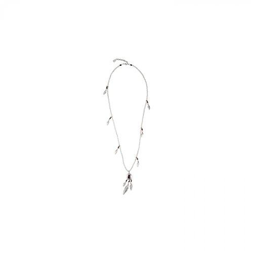 Collar largo compuesto de varias piezas mojadas en plata y terminado en el centro por una pluma con forma de medallón de piedra violeta. También presenta pequeños colgantes también en plata con forma de plumas más pequeñas. Fabricado por UNOde50 en España de forma totalmente artesanal.