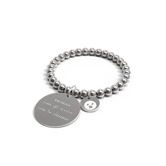 BRACELET '10 BONNES DEMANDES' LONGUEUR ELASTIQUE 17cm EN ACIER INOXYDABLE NICKEL GRATUIT. SPHERE DIMENSION 6mm AVEC MÉDAILLE DE 28mm AVEC GRAVURE 'A PARTIR D'AUJOURD'HUI JE NE LES ÉCRIT PAS' ET SUR LE DOS LA MARQUE ANNA BIBLO.