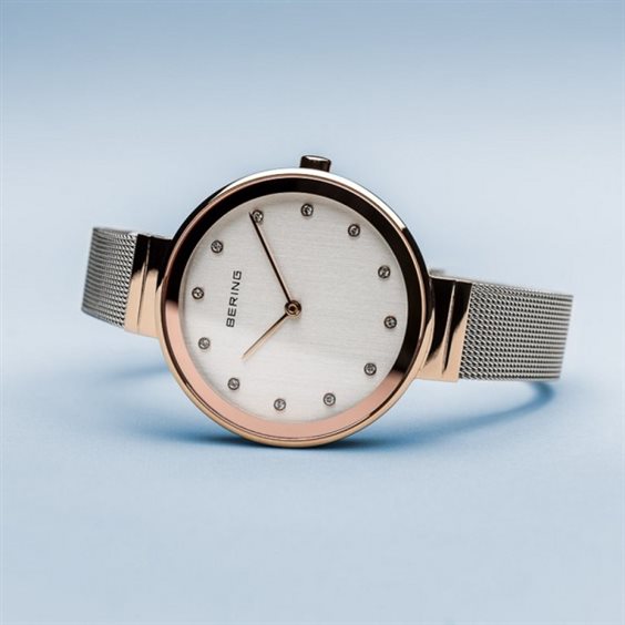 Classic Time Collection Montre à temps plein féminin de Bering. 34 Mm Dimension Case, or rose brillant et en acier inoxydable. Modèle avec bracelet en argent, Made In Milan, avec déclenchement. Cette horloge à cadran argenté, avec du verre saphir. Finition est Pink Oro Ip. Modèle de mouvement à quartz et résistance à l'eau au 3 Atm. Caractéristiques supplémentaires: Pierres Swarovski, 3 ans de garantie.