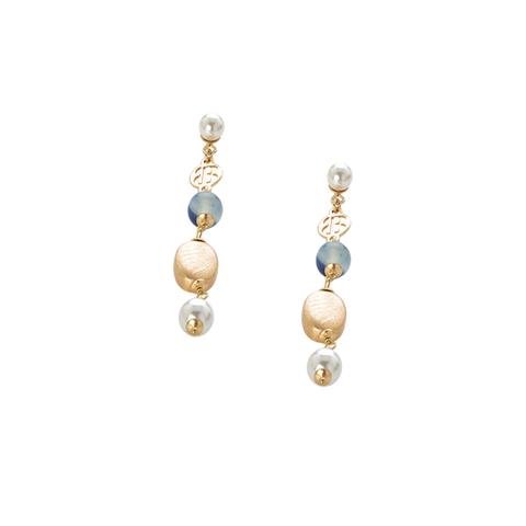 Boucles d'oreilles en bronze plaqué or jaune avec perles blanches Swarovski et boucles en agate bleue (8 mm). Longueur 6,5 cm.