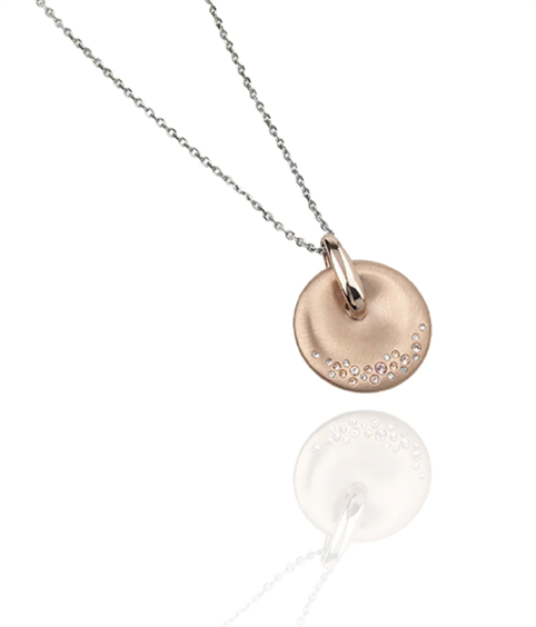 Chaîne rolò avec pendentif en acier rosé et zircons allant du blanc au bronze.