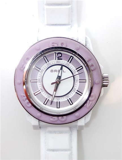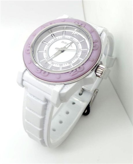 Boîtier en acier de 35 mm recouvert de polycarbonate de haute technologie. Lunette en acier avec inserts en polyuréthane coloré. Couronne en acier. W.R.10 atm. Bracelet en polycarbonate haute technologie avec inserts en acier.