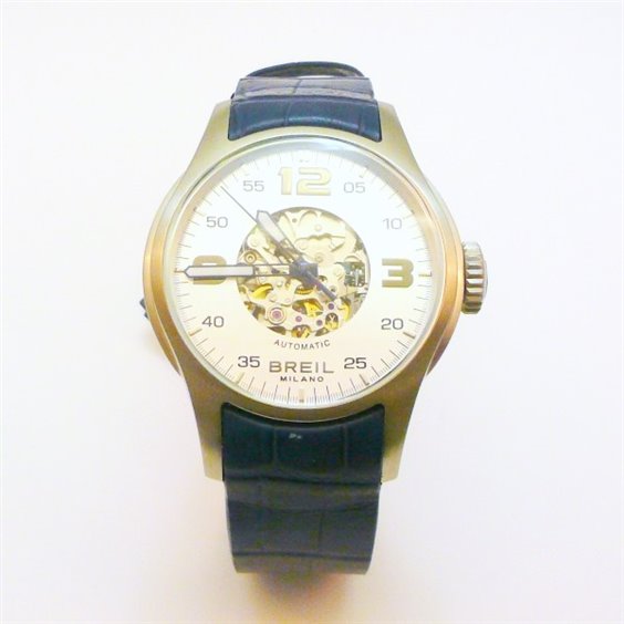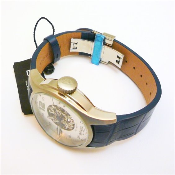 Breil Globe automatique avec boîtier rond en acier inoxydable et bracelet en cuir bleu.