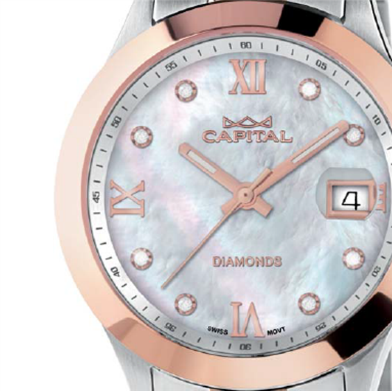 Mouvement Quartz Swiss Made avec DateN.8 Vrai Diamants sur le Cadran - Taille Full Cut - H Couleur - Carats total 0.064 ct et Bracelet en acier bicolore Rosè - Fond à vis - Verre minéral - Boîtier ø 34 mm