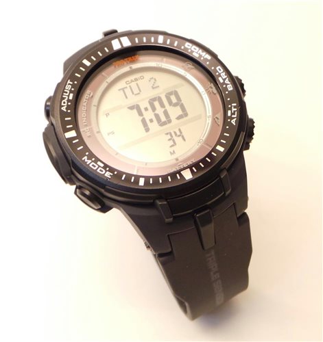 Montre multifonction.Fabriquée en résine noire mate, fond en acier, Ø 44mm. 12,4 mm d'épaisseur. Mouvement numérique à quartz Tough Solar (charge solaire ou tout type de lumière) Multi Band 6 (radiofréquence 6 fréquences: UK.-D-USA-Japon-Chine), trois capteurs: boussole numérique, baromètre / thermomètre, altimètre. Heure internationale 48 villes (31 fuseaux horaires), chronomètre 1/100 sec. Minuterie. 5 alarmes quotidiennes (réveils). Affichage du lever / coucher du soleil Verre minéral. Cadran positif, éclairage LED, bracelet en résine noire. Imperméable 10 atm. Poids 63 grammes. Garantie 2 ans.