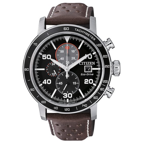 Montre chronographe. Boîtier en acier brossé et poli, fond vissé, lunette noire avec tachymètre, poignée 22mm. Mouvement Eco drive avec charge légère avec réserve de marche de 270 jours. Chronographe du 15ème siècle jusqu'à 60 minutes. Verre minéral Cadran noir avec aiguilles lumineuses. Bracelet en cuir marron foncé. Garantie 2 ans.