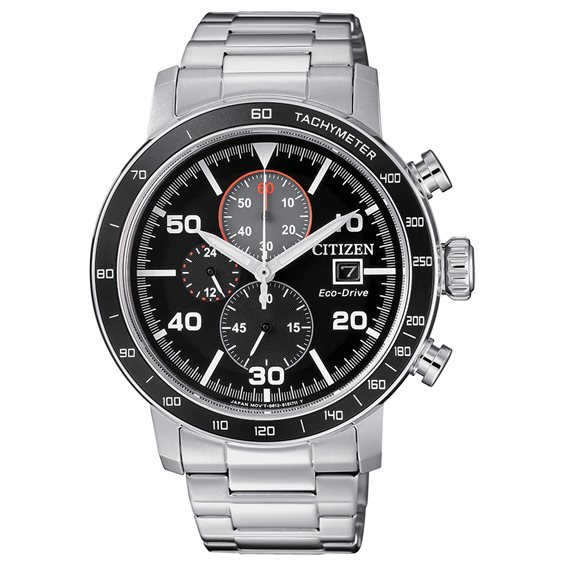 Montre chronographe. brossé boîtier en acier inoxydable avec vissée, lunette noire avec tachymètre. Eco mouvement d'entraînement à des charges légères avec une réserve de marche de 270 jours. Chronographe 1 5 SEC. jusqu'à 60 minutes. verre minéral. Cadran noir avec des aiguilles lumineuses. bracelet réglable en acier poli et brossé, boucle déployante avec boutons poussoirs. 2 ans de garantie.