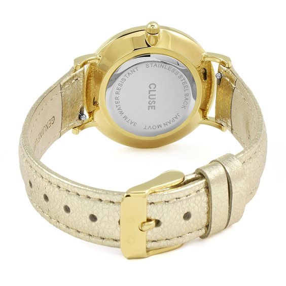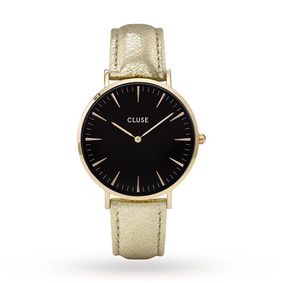 Ce modèle de ligne La Bohème est parfait pour illuminer votre tenue et peut être porté de jour comme de soirée pour un look vraiment tendance. La montre dispose d'un boîtier en or ultra mince de 38 mm de diamètre, usiné avec précision pour des résultats sophistiqués et élégants. Le noir est assorti avec un bracelet en cuir plaqué or métallique, fini avec une boucle en or. La sangle est facilement interchangeable et vous permet de personnaliser votre montre. Aussi disponible en or rose et argent.