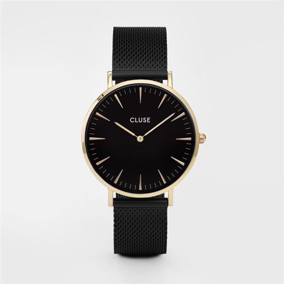 Clone Clown Femme seule Collection La Boheme. Modèle en acier, pvd or et pvd noir. Pvd Diamètre en or jaune de 38Mm de diamètre et cadran noir avec verre minéral. Bracelet en acier inoxydable et boucle en ardiglione. La résistance à l'eau est de 3 Atm.