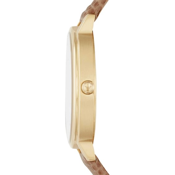 Horloge avec crème nacrée, beige et zircons aux index. Couronne et base en acier doré. Bracelet en cuir imprimé lézard beige avec ardillon doré.