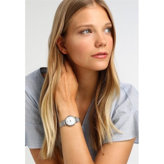 Horloges à fond blanc en nacre, verre minéral. Couronne et tampon de pression. Bracelet milanais avec attaque de Van Cliffe