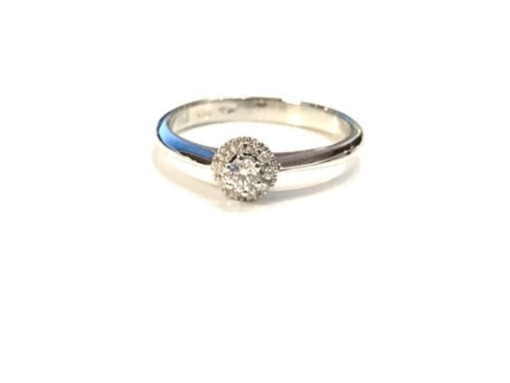 Une bague solitaire centrale de 0,05 carat avec un contour qui tourne de onze diamants pour un total de 0,10 carat.