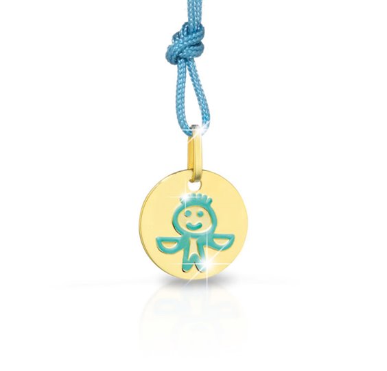 ZODIAC. PENDENTIF OR JAUNE SCALE CELESTE POLONAIS. CORDE BLEU CLAIR DIAM. 12 MM