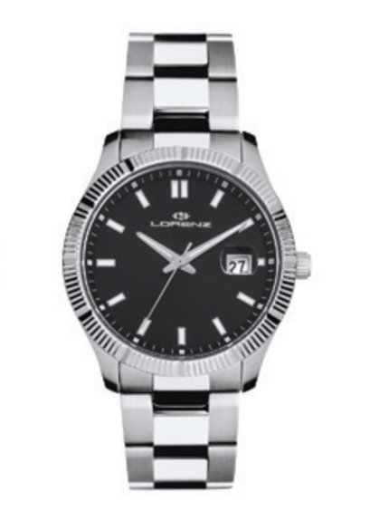 MONTRE LORENZ FEMME AVEC ÉTUI EN ACIER, INDICES DE NUMÉROS NOIRS ET LANCETTE DATAR HEURE FLUORESCENT ET ARGENT 3. SANGLE EN ACIER RÉGLABLE.