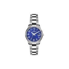 Montre à quartz pour femme avec boîtier en acier rond à cadran bleu et index des heures bleus avec chiffres et aiguilles arabes. Aiguilles fluorescentes de 3 heures avec lentille sur le verre Bracelet en acier réglable avec fermeture à déployant.