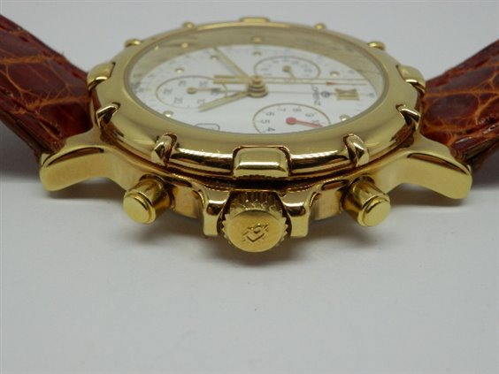Montre chronographe avec affichage de la date à 4 heures, échelle tachymétrique sur le cadran, monture sur boîtier en plaqué or jaune Mouvement suisse à quartz. Bracelet en crocodile marron.