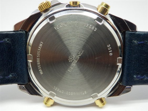 Montre chronographe avec alarme, lunette tournante unidirectionnelle, échelle tachymétrique, compteurs de couleur argentée contrastante, guichet date à 4h, bracelet en cuir bleu.