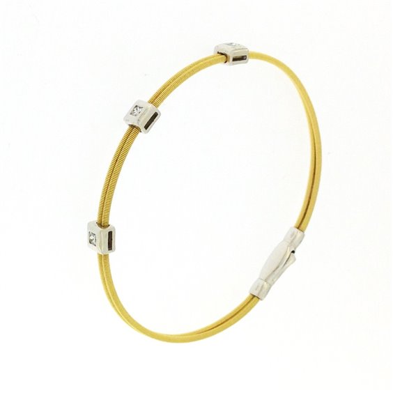 Traitement de corde de guitare de bracelet d'or jaune à deux fils avec des diamants de 3 carats total 0.20ct. gaufré avec de l'or blanc. Fermeture à baïonnette en or blanc 18 carats.