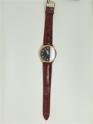 Montre à quartz pour homme, cadran noir avec chiffres arabes dorés, affichage de la date, bracelet en crocodile. Fabriqué en Suisse
