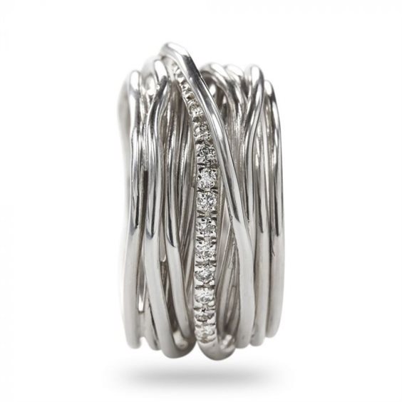 Comme les émotions, les pensées et les souvenirs laissent une marque indélébile sur nos âmes, de sorte que les lignes et les sillons dans les fils en arrière et tours d'un anneau, qui rappelle à l'utilisateur, les moments les plus spéciaux et uniques pour toujours. Inspiré par l'ancienne foi tibétaine, un symbole de bonne chance pour les futures mariées, nous avons donné une nouvelle vie à ce précieux bijou. Amour, joies, anniversaires, naissances, unions et mariages: Filodellavita® est l'anneau avec lequel chaque expérience devient matière, prend forme dans des fils précieux et brille avec vitalité. Chaque bague est faite à la main par un artisan italien, dans ce cas il a 13 fils en argent palladium rhodié avec 16 diamants serties en agrafes pour un total de 0,21 ct.