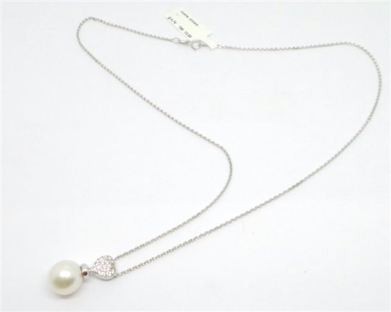 Chaîne en or blanc forçant le diamant avec le diamètre central de perle d'eau douce de 9,5 mm dans la partie au-dessus du coeur pavé de zircons mesurant 7 x 7 millimètres se fermant avec le ressort ouvert. certificat de garantie et poinçonnage