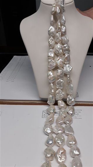 3 brins de perles orientales cultivées d'eau douce, perles de diamètre 18-20mm, longueur de fil 42 cm, fils avec une bonne lumière. Également disponible en fermoir à trois fils d'argent mesurant 2,5 x 1,20 cm.