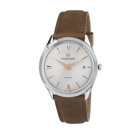 SEULEMENT TEMPS DE CHARGE MÉCANIQUE AUTOMATICA_GENT 41,6 MM__Il de charme vintage répond à l'excellence de la technologie contemporaine. bien _Materiali et attention aux détails minutieux, tous ponctués par le rythme du mouvement mécanique à remontage automatique. _La style impeccable de la collection s'exprime parfaitement dans le modèle avec cadran d'argent vagues finement travaillées et avec les mains et les chiffres dans IP en or rose.