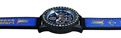 CASSA in acciaio 316L, Ø 44 mm, finitura nero PVD. FONDO CASSA in acciaio lucido serrato a vite con zona adibita a incisioni personalizzate. CORONA a vite personalizzata con logo A.M. PULSANTE crono in acciaio e terminale in ergal aeronautico. GHIERA girevole unidirezionale monopezzo VETRO minerale 700 Vickers antigraffio, con trattamento antiriflesso. IMPERMEABILITA’ 10 ATM (100 m); Standard ISO 6425* MOVIMENTO Crono Quarzo Cal OS20 Miyota Co. Ltd. QUADRANTE blu avio con rehaut tachimetro. Grafica e posizionamento dei contatori cronometrici ispirati alla strumentazione aeronautica. LANCETTE crono a forma di freccia, ore e minuti ad alta visibilità notturna. CINTURINO in gomma sovracucita e nylon ricamato, personalizzato Frecce Tricolori.