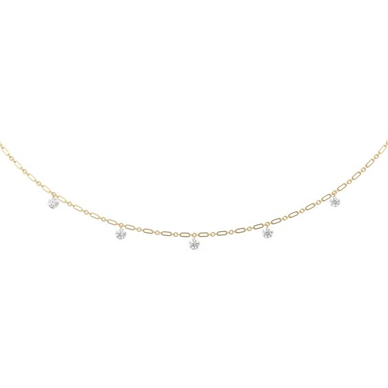 Questo girocollo realizzato in oro giallo riciclato 18 KT incastona 5 diamanti AMA taglio brillante con un foro per un totale di 0.80 ct