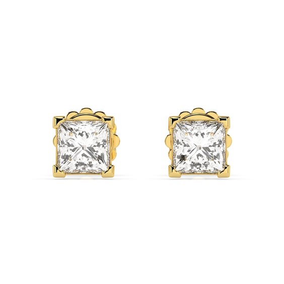 Questi orecchini realizzati in oro giallo riciclato 18 KT incastonano 2 diamanti AMA taglio princess per una caratura totale di 1.48 ct