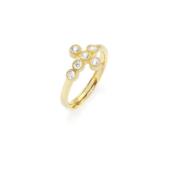 Anello Regolabile Croce Dorato con Zirconi Bianchi su Castone Tondo in argento 925 dorato con croce di zirconi bianchi su castone tondo. Misura regolabile dalla 10 alla 14
