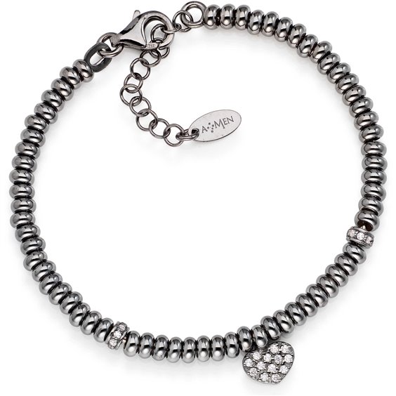 Bracciale in Argento 925/°°° con rondelle rodiate effetto brunito con ciondolo a cuore tempestato di zirconi; lunghezza personalizzabile da 16 a 19 cm