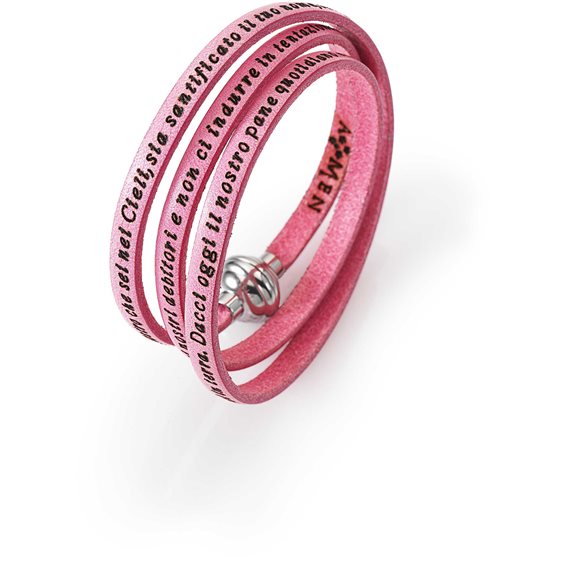 Bracciale in pelle rosa con inciso Padre Nostro in italiano.