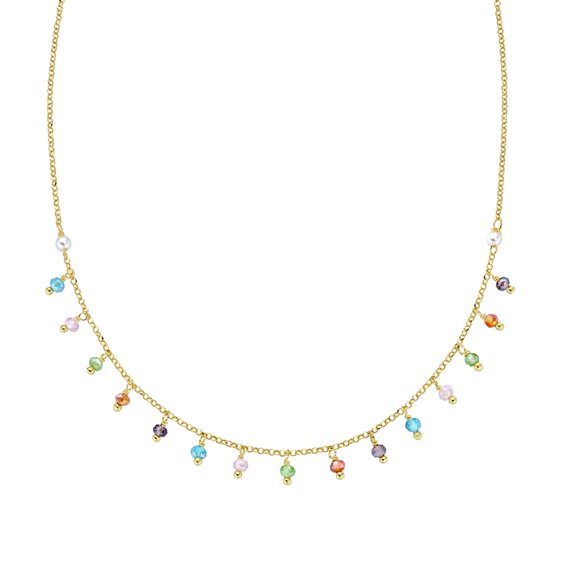 Collana in Argento 925 e finitura in Oro con perle e cristalli multicolore. Lunghezza 38 + 5 cm.