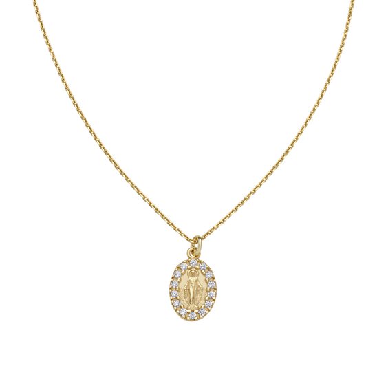 Collana in argento 925 dorato con medaglietta Madonna Miracolosa bordata di zirconi bianchi. La medaglia è lunga 1,1 cm, mentre la catena ha lunghezza regolabile da 40 a 45 cm con allungo e chiusura a moschettone.