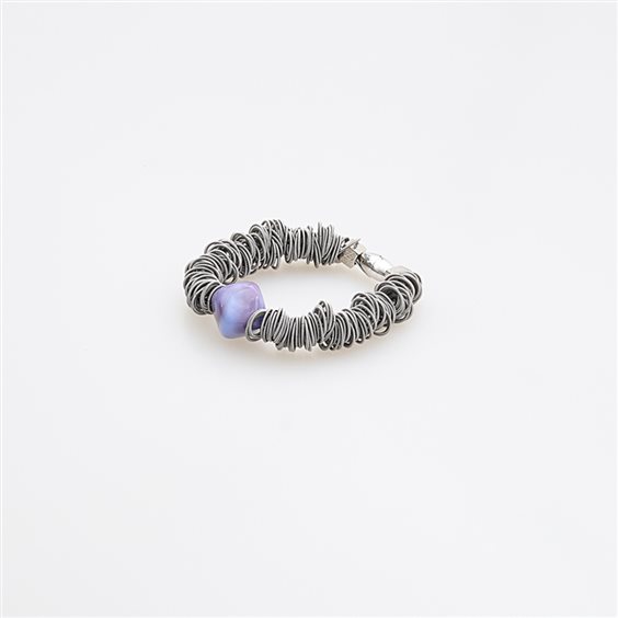 Bracciale realizzato con una perla in vetro di Murano soffiata a bocca e lavorata a caldo secondo la tecnica del vetro sommerso in modo da ottenere le sfumature di colore. Gli anellini che la avvolgono sono in molla d'acciaio totalmente anallergico. Il fermaglio, in materiale anallergico, funziona a calamita rendendolo praticissimo da indossare.