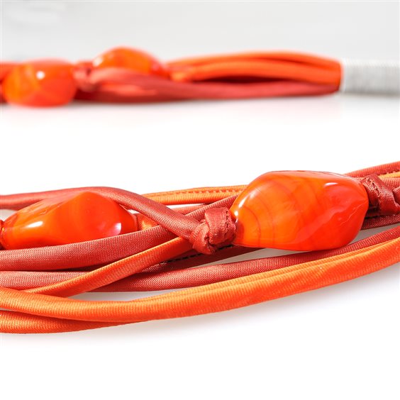 Collana realizzata con tubolare in tessuto in due colori cui sono abbinate delle perle di Vetro di Murano. Ogni singola perla in vetro è soffiata a bocca da esperti artigiani e nessuna è mai identica all’altra, così come per tutte le creazioni presenti nella nostra collezione di gioielli. La parte finale è chiusa da molle in acciaio. La chiusura è in materiale anallergico. Lunghezza: cm.70 interno, cm.100 esterno.