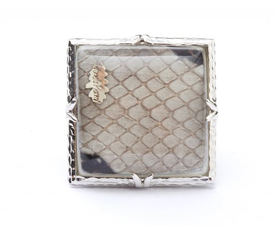 anello in argento e resina naturale epossidica, contenente pelle di pitone di forma quadrata.anello in argento massiccio 925%°, con corona misura 30x30mm diamantata a mano, completo di resina naturale epossidica trasparente contenente elementi fantasia e 2 ovali in resina colore avorio riportanti le iniziali AP di Antonella Piacenti. All'interno sistema regolabile in argento 925%° per il diametro del dito.