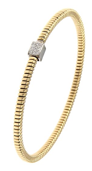 BRACCIALE RIGIDO MAGLIA TUBOGAS IN ORO GIALLO CON CUBOTTO CENTRALE IN ORO BIANCO E DIAMANTI PER 0,07 CT G COLOR VS1 ANIMA IN TITANIO