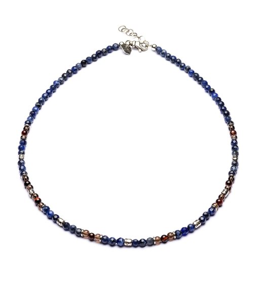 Antracite collana sodalite, quarzo fume, occhio di tigre rosso e argento