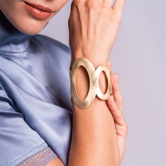 Bracciale rigido traforato in AG 925‰ placcato oro giallo 23 ct, piegato e satinato a mano Rivestimento con speciale trattamento che protegge dalla naturale ossidazione del metallo Fatto a mano in Italia Placcature rigorosamente senza alcun rilascio di nichel e cadmio