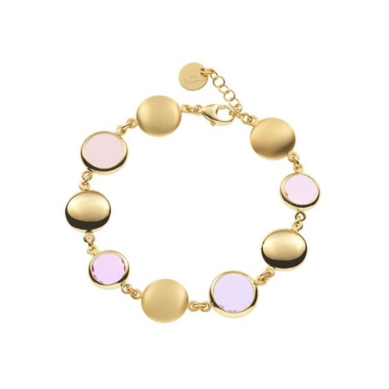 Bracciale in AG 925‰ placcato oro giallo 23 kt. con saponette e paste vitree rosa. lunghezza da cm 17.5 a cm. 19.5 Realizzata interamente a mano, questa creazione Aquaforte nasce dalla passione e dall'esperienza di maestri orafi artigiani. La placcatura in oro giallo 23 carati, rivestita da uno speciale trattamento, è rigorosamente eseguita senza alcun rilascio di nichel e cadmio.