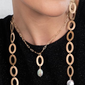 Collana Perle Vintage con pendente formato da un elemento a lastra ovale e una perla barocca Collana con pendente formato da un elemento a lastra ovale e una perla barocca in AG 925‰ placcato oro giallo 23 ct. argento 925‰ placcatura in oro giallo 23 carati rivestimento con speciale trattamento che protegge dalla naturale ossidazione del metallo orgogliosamente fatto a mano in Italia placcature rigorosamente senza alcun rilascio di nichel e cadmio comfort fit