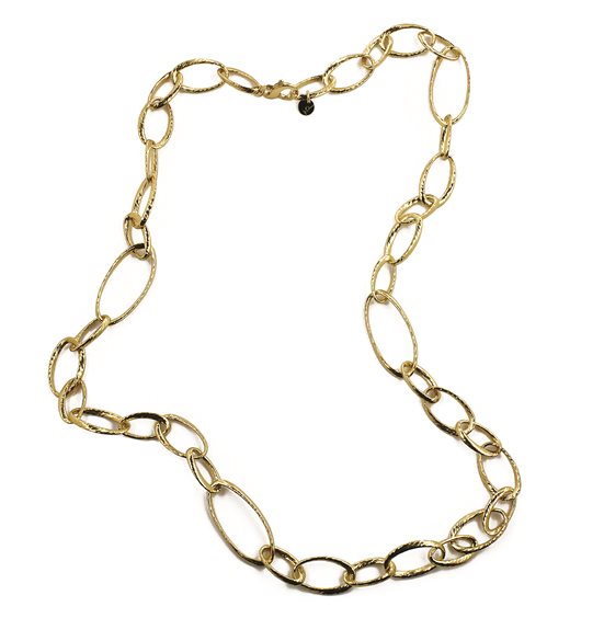 Collana lunga con anelli ovali di varie dimensioni in argento 925‰ placcato oro giallo 23kt. argento 925/000 placcatura in oro giallo 23 carati rivestimento con speciale trattamento che protegge dalla naturale ossidazione del metallo orgogliosamente fatto a mano in Italia placcature rigorosamente senza alcun rilascio di nichel e cadmio comfort fit