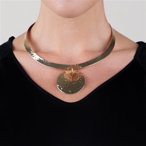 Collana in AG 925‰ placcato oro giallo 23 kt. con pendente effetto martellato diam. cm.5. Lunghezza Cm 80 + ext. argento 925/000 placcatura in oro giallo 23 carati rivestimento con speciale trattamento che protegge dalla naturale ossidazione del metallo orgogliosamente fatto a mano in Italia placcature rigorosamente senza alcun rilascio di nichel e cadmio comfort fit