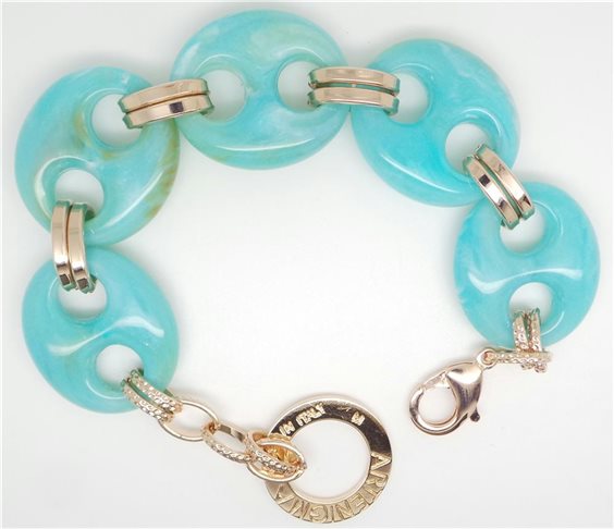 bracciale maglia marina, resina colorata e bronzo, chiusura moschettone, lunghezza totale 22 cm, altezza maglia 24 mm