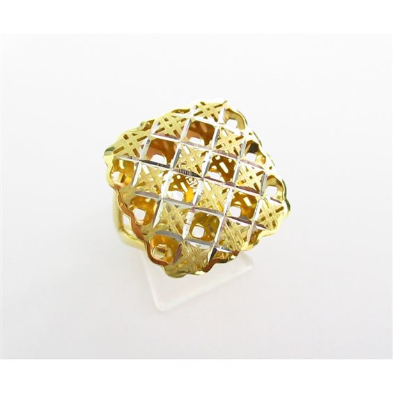 Anello in oro giallo e bianco 18 carati ideato e realizzato da maestri orafi italiani, l'anello ha una lavorazione intrecciata, peso 4,8 grammi, misura 16.