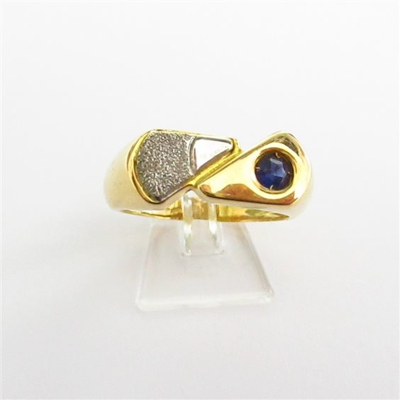 Anello in oro giallo e bianco 18 carati ideato e realizzato da maestri orafi italiani, l'anello è impreziosito da un zircone blu, peso 6,43 grammi, misura 20.